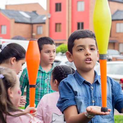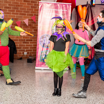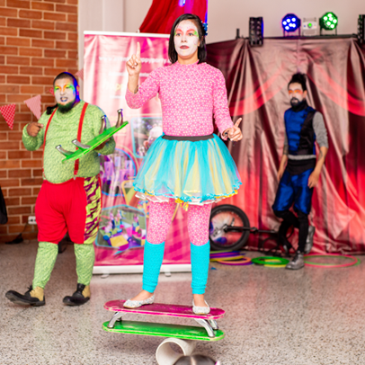 Incluye 3 personajes los cuales integran a los asistentes en divertidos juegos con pelotas, aros, clavas, monociclos, diabolos, pulsadas y rolas,